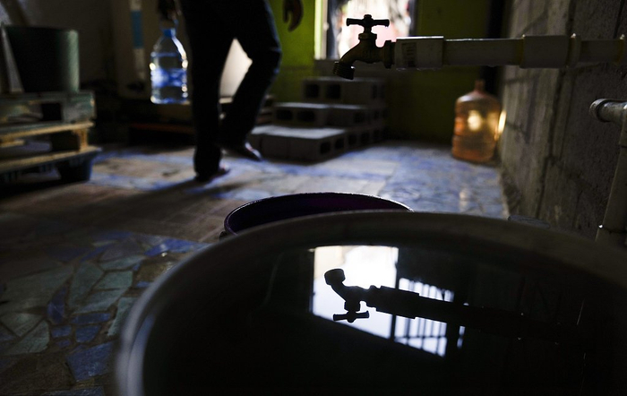 当地时间2023年5月9日,墨西哥蒂华纳,人们用水桶蓄水。由于高温干旱,当地正面临着一场水危机。