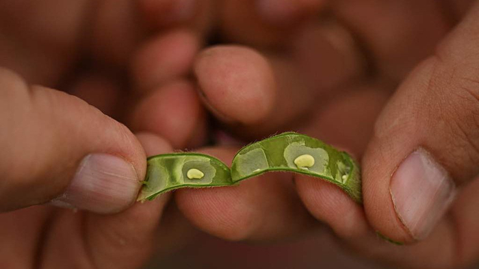 当地时间2023年3月30日,阿根廷布宜诺斯艾利斯,农民展示了受干旱和高温影响的大豆。阿根廷今年正面临几十年来最严重的干旱,大豆、小麦和玉米作物受到了毁灭性的影响。