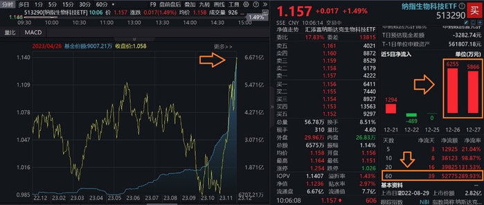ETF方面,今日(12.28),全市场唯一表征美股创新药的上市ETF——纳指生物科技ETF(513290)再次跳空高开,涨超1%,盘中价再创年内新高,强势冲击4连阳!开盘不到30分钟,纳指生物科技ETF(513290)成交额就已超5700万元,早盘成交额或有望超1亿元,溢价率超1%,买盘资金强势!周度来看,纳指生物科技ETF(513290)连续三周交投放量,上周成交额高达3.13亿元,创下基金2022年8月上市以来单周成交额最高记录!