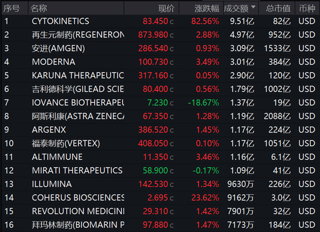 纳指生物科技板块指数成分股中,生物制药公司Cytokinetics(CYTK)表示,试验显示其正在研发的心脏病药物可以有效帮助患有遗传性心脏病的患者,这引发了有关该公司可能被收购的情绪预期,Cytokinetics大涨82.54%;指数其他成份股方面,莫德纳(Moderna)、Altimmune涨超3%,再生元制药涨超2%,阿斯利康、Argenx、illumina、拜玛林制药涨超1%,安进、吉利德科学、福泰制药纷纷收涨。