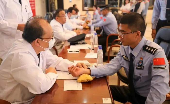 2023年8月9日,国家移民管理局和国家中医药管理局联合举办的2023年度“送医送药下基层”活动启动,图为医疗专家在西藏边检总站日喀则边境管理支队坐诊。