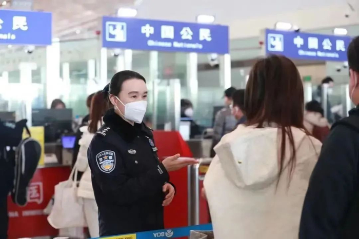 2023年1月8日,新冠病毒感染实施“乙类乙管”后,全国边境口岸有序恢复正常通关。全国移民管理机构及时调整勤务模式,最大程度优化旅客查验流程,保障旅客顺畅通关。图为北京边检总站移民管理警察在执勤现场维持秩序。