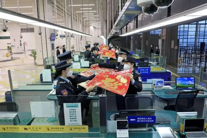 1月22日,在港珠澳大桥珠海公路口岸珠澳出境大厅,珠海边检总站、澳门特区政府治安警察局联合举行“玉兔迎春跃新程·珠澳连心守大桥”联勤联动仪式。图为双方互赠礼物。