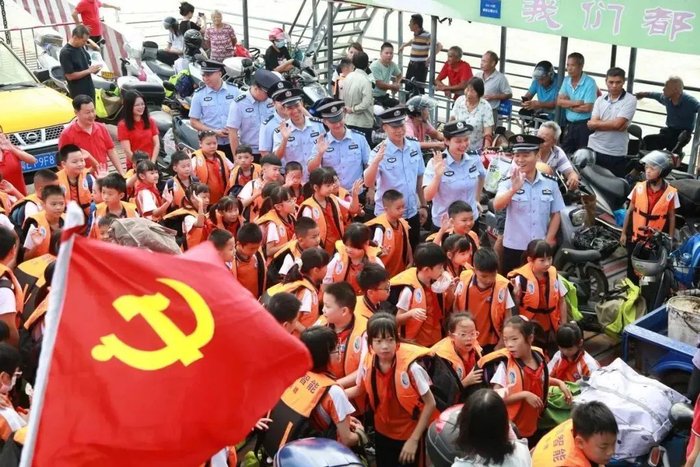 2023年9月1日开学当天,正值超强台风“苏拉”逼近广东,广州边检总站南海边检站移民管理警察护送学生乘坐轮渡前往位于江心岛的学校上学。
