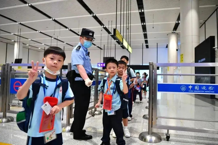 2023年11月8日,莲塘口岸年出入境人员突破1000万人次,出入境车辆超63万辆次。图为深圳边检总站莲塘边检站移民管理警察护送“跨境学童”通关。