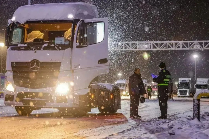 2023年12月份以来,全国多地出现降温强雪天气,广大移民管理警察全力以赴保通关、保安全、保民生。图为12月12日,新疆边检总站霍尔果斯边检站移民管理警察风雪中在公路口岸执勤,保障车辆顺畅通关。