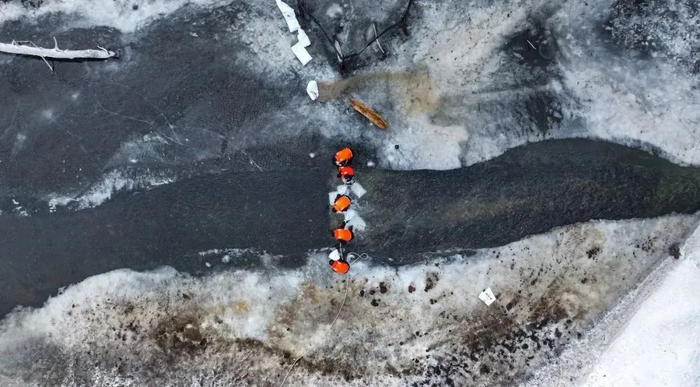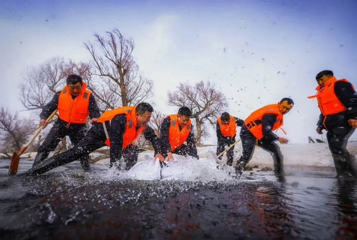 2023年3月8日,新疆额尔齐斯河南岸的阔斯阿热勒村一处桥下,融雪性洪水即将溢出河道。新疆边检总站齐巴尔边境派出所移民管理警察紧急搭建沙土堤坝,经过2小时连续奋战,成功阻挡河水向辖区漫延。