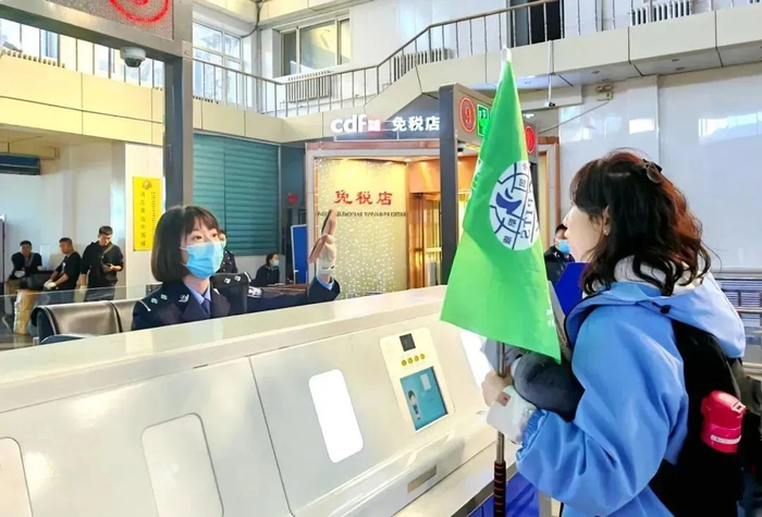 2023年9月21日,黑龙江边检总站黑河边检站移民管理警察为中国赴俄罗斯首个免签旅游团办理通关手续。