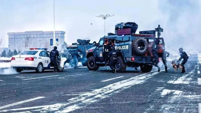 2023年12月15日,内蒙古边检总站巴尔虎突击队冒着风雪严寒开展反恐演练,锤炼极端天气下的实战水平。