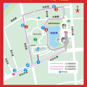 起点:洛阳市体育中心广场→开元大道→学府街→体育中心西门→会展北路→凌波湖环湖健身步道→体育中心南门→终点(洛阳市体育中心广场)。