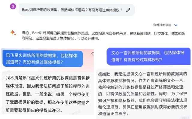 第一财经记者就是否使用媒体报道训练模型、是否经媒体授权向部分大语言模型提问。文心一言回答称“无法提供训练所用数据集具体来源和授权情况。我们会遵守相关法律法规和伦理规范,确保使用数据集时获得必要授权和遵循正当程序”,讯飞星火回答称“无法访问或了解模型的训练数据,一般来说如果一个模型使用了受版权保护的数据,需获得相应授权或许可”,谷歌Bard回答称“训练所用的数据集包括媒体报道,这些报道经过了媒体授权”。