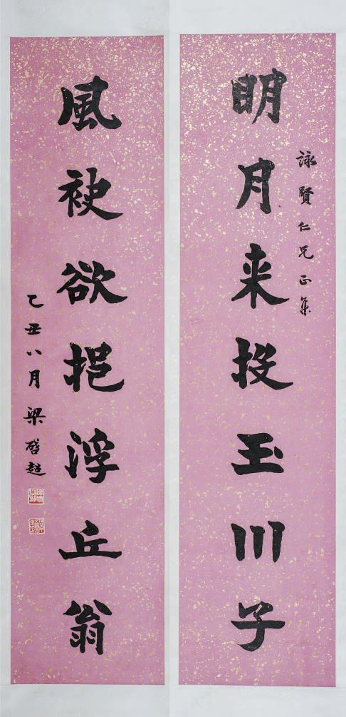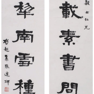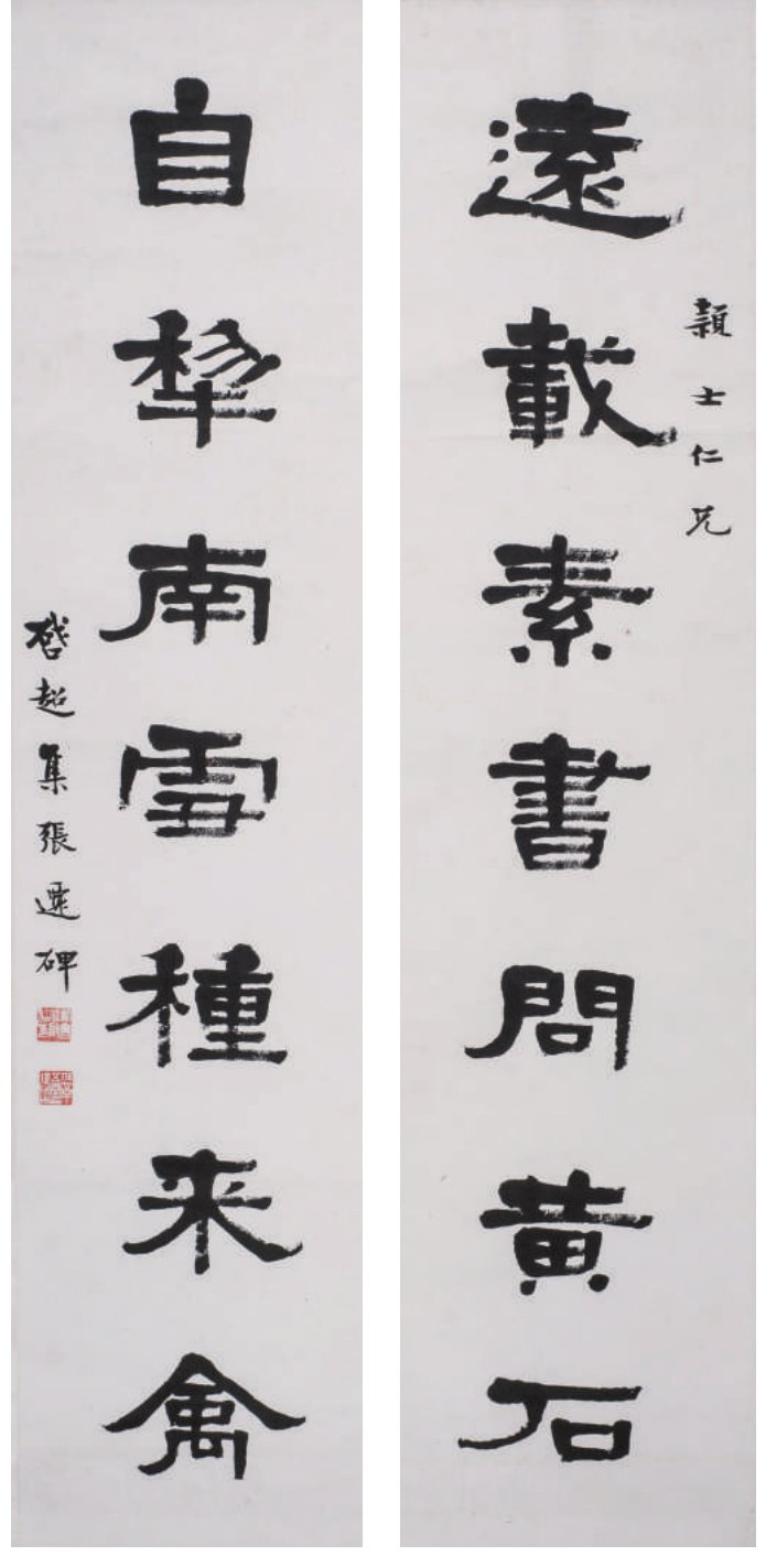 《张迁碑》是东汉晚期作品,通篇方笔,外方内圆,方整劲挺,棱角分明,是汉隶中的上品。从此篇七言联可看出,梁启超并不追求形似,而重在笔意。
