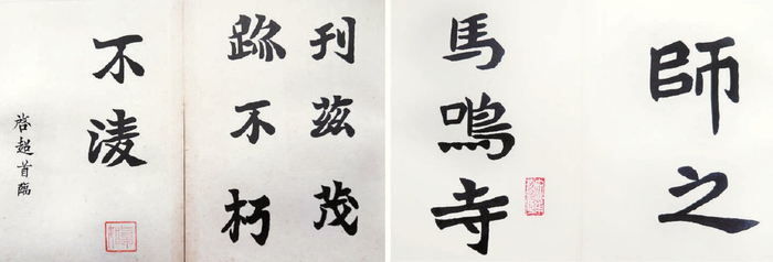 “临《马鸣寺碑》册”是梁启超先生临摹马鸣寺碑的墨宝。《马鸣寺碑》亦称为《马鸣寺根法师碑》,立于北魏正光四年(523年)。此碑笔法独具一格,字体结构紧凑茂密,左抑右昂,横侧生姿;笔调丰脾厚沈,转折方折,波发饱满锐利,侧、掠、弯钩之处则带有弧形,可谓方圆对比富于变化,收刚柔相济之妙。梁启超的魏碑书法直接取法该碑,曾自述“支道林爱蓄马,或问之,曰‘吾赏其神俊。吾生平酷嗜根法师碑,亦以此’”。梁启超先生在临摹时,一笔一画皆忠实于原碑文,即是半边残字,也照临不苟。