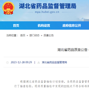 根据湖北省药品监督抽检计划安排,各级药品监督管理部门对全省药品生产、经营和使用单位的药品质量进行了抽查检验。现将质量抽检中发现的22批次不符合标准规定药品予以公告(详见附件)。