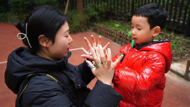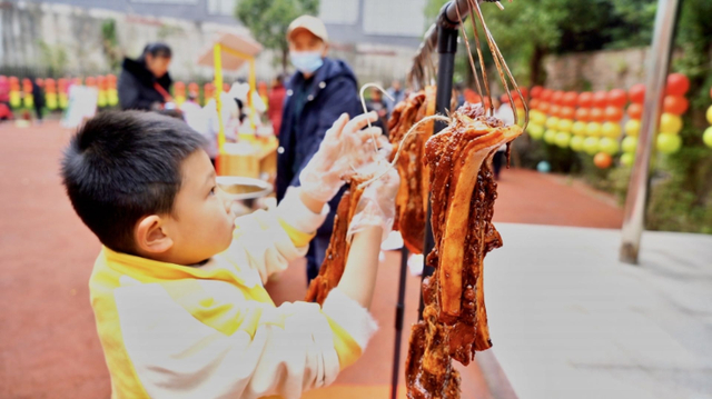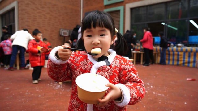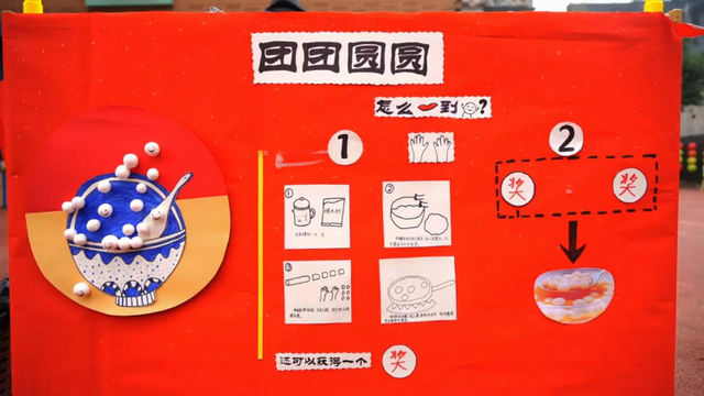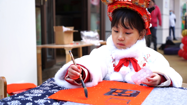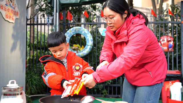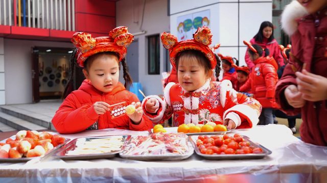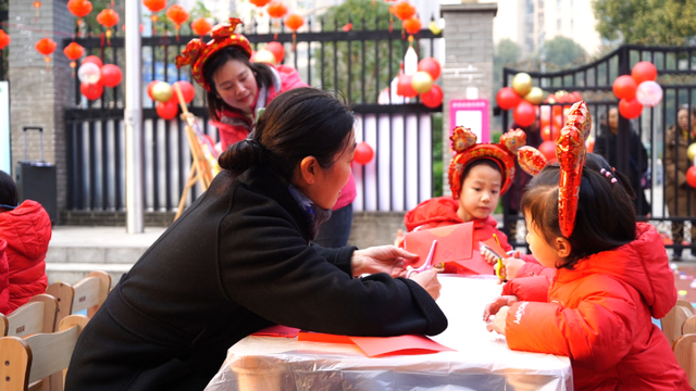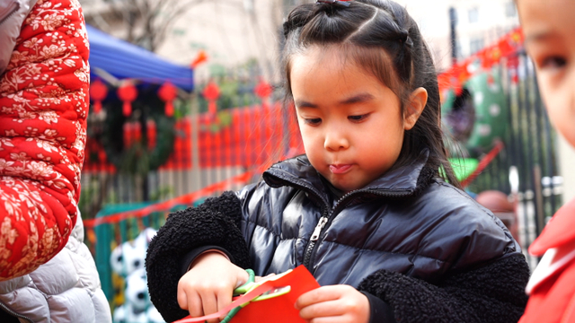 剪窗花、投壶、跳竹竿舞、看皮影戏、套圈、吃汤圆……渝北区两江第一幼儿园的孩子们兴奋地穿梭在各个摊位之间,体验各种传统习俗、民间游戏以及年“味”活动。