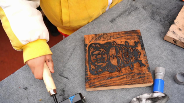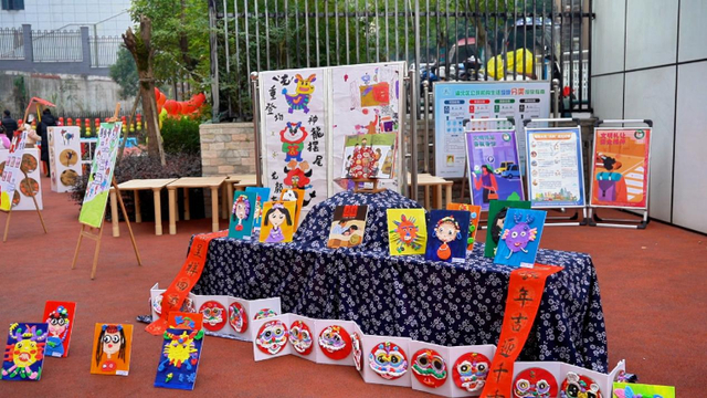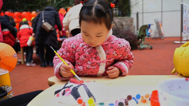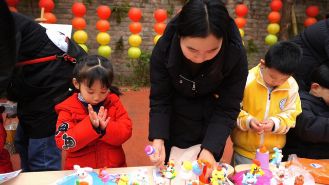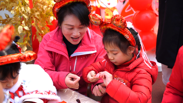环雅园的幼儿们趣集“五福”,喜迎龙年。大班幼儿们和小班幼儿们手牵手,在非遗糖画甜甜屋里制作糖画、在操场上彩绘石膏娃娃……