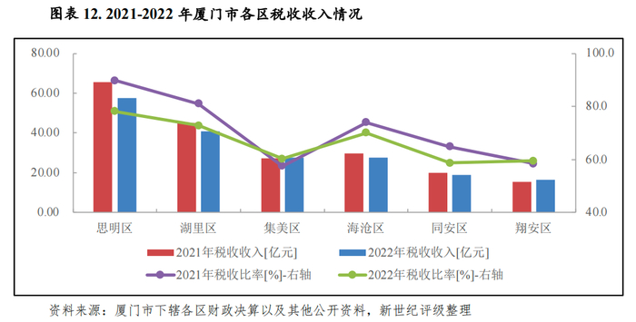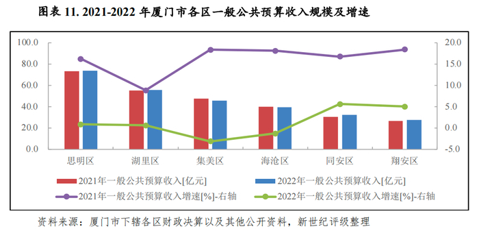 厦门市在财政分配上由市本级统筹较大,下辖各区财政实力普遍有限,岛内思明区和湖里区依托良好的区位优势和较好的产业结构,一般公共预算收入规模稳居各区前二,2022年分别实现73.91亿元、55.92亿元。集美区和海沧区次之,分别为46.07亿元和39.64亿元;同安区和翔安区仍位列后两位,分别为32.40亿元和27.96亿元。从增速看,2022年厦门市各区一般公共预算收入呈现“四升二降”,其中由于收入基数相对较小,同安区、翔安区收入相对增长较快,同比分别增长5.7%和5.1%,思明区、湖里区同比分别增长0.9%和0.6%,集美区和海沧区收入出现下滑,同比分别下降3.1%和1.3%。