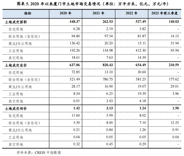 土地市场方面,2022年受政府土地出让规划、市场行情因素等影响,厦门市土地成交面积在工业用地带动下大幅增长,2022年全市共成交土地面积527.49万平方米,同比增长100.9%,其中工业用地412.30万平方米,同比增长205.5%。全市土地成交总价654.49亿元,同比下滑20.2%,主要是综合用地(含住宅)成交额下滑所致。2023年前三季度,厦门市土地出让总面积140.03万平方米,当期土地成交总价为210.59亿元,仅约2022年全年规模的三分之一。