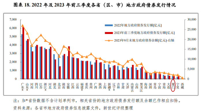 政府债券发行方面,2022年厦门市共发行地方政府债券400亿元,发行规模在计划单列市中处于末位。其中,新增债券347亿元(一般债券23亿元,专项债券324亿元),再融资债券53亿元(一般债券13亿元,专项债券40亿元);按级次分,市级发行债券347亿元,区级发行债券53亿元。当年新增债券主要用于岛外新城开发、翔安机场建设和城市交通基础设施建设等,债务风险安全可控。2023年前三季度,厦门市累计发行地方政府债券344亿元。截至2023年9月末,厦门市地方政府债券余额2077亿元。