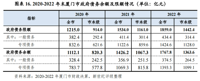 2022年以来厦门市地方政府债务保持较快增长,截至2022年末,厦门市政府债务余额为1767.8亿元,较上年末增长24.0%;其中一般债务374.5亿元、专项债务1393.3亿元,分别较2021年末增长4.9%和30.3%。2022年厦门市政府债务限额为1859.0亿元,其中一般债务限额434.4亿元,专项债务限额1424.6亿元,债务余额均控制在限额以内。