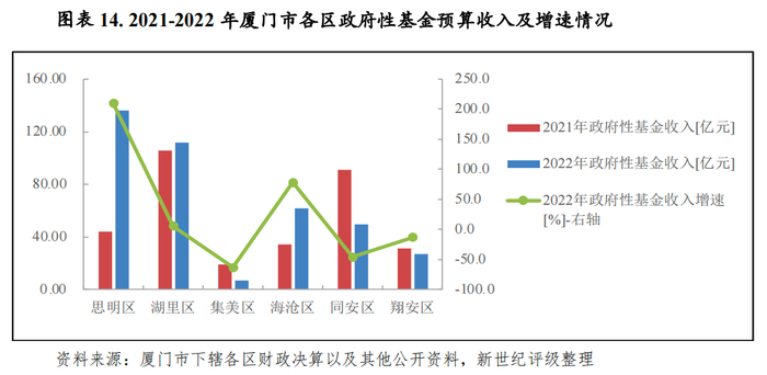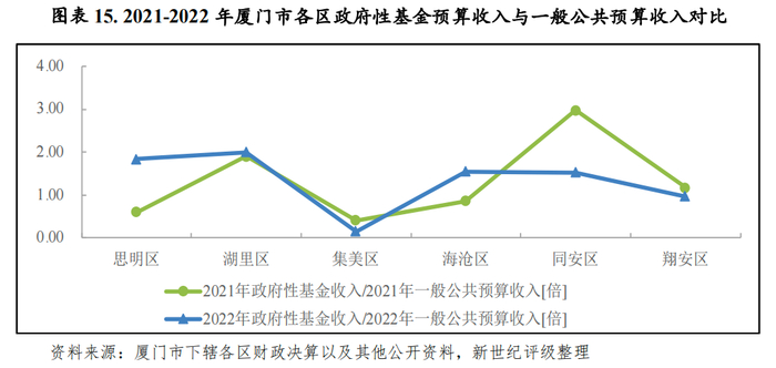 从地方财力稳定性看,2022年集美区政府性基金预算收入对财力的贡献度最低,当年政府性基金预算收入与一般公共预算收入的比仅为0.16倍,翔安区该比值为0.98倍,其余区均在1.5倍-2.0倍之间,政府性基金预算收入对财力的贡献度较高,财力稳定性相对较弱。