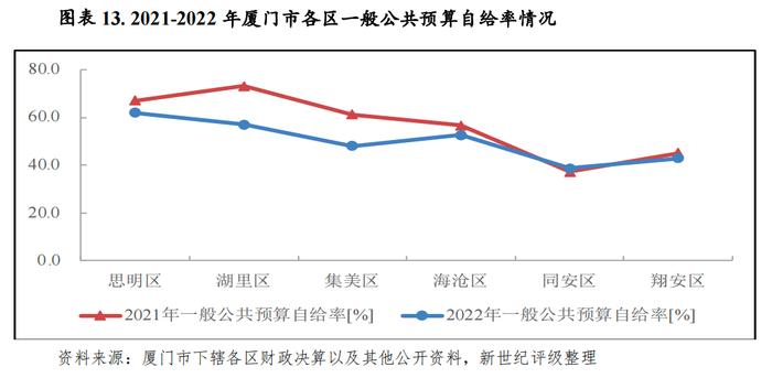 财政自给率方面,厦门市下辖各区一般公共预算自给率相对偏低,均需依靠上级转移支付平衡财政资金缺口。2022年除同安区一般公共预算自给率较上年略有提升外,其余各区均有所下降。思明区、湖里区、海沧区一般公共预算自给率分别为61.9%、56.9%和52.6%,其余三区均在50%以下,同安区一般公共预算自给率仍居全市末位,2022年为38.7%,较上年提高1.4个百分点。