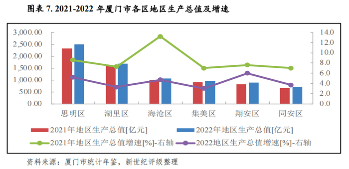 厦门市下辖各区经济发展存在一定差异。2022年厦门市各区经济均保持增长态势,增速在3.0%-6.0%之间,较上年均有一定回落。思明区是厦门老城区老港区所在地,以商业、金融业、旅游业、服务业等第三产业为主,工业比重较小,经济总量在全市占有领先地位,2022年地区生产总值为2503.88亿元,同比增长5.2%;其次是湖里区,实现地区生产总值1681.94亿元,同比增长3.3%。岛外四区中海沧区2022年经济总量突破千亿,与第四位的集美区之间差距进一步拉大,当年集美区、翔安区和同安区分别实现地区生产总值956.58亿元、887.14亿元和705.63亿元,其中翔安区经济增速为6.0%,位列全市各区首位,保持较好的赶超发展趋势。