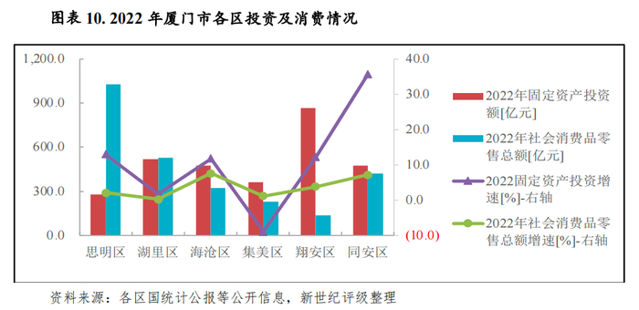 消费方面,2022年厦门市下辖各区社会消费品零售总额均实现不同程度增长,增速在0.2%-7.6%之间。其中思明区2022年社会消费品零售总额为1028.40亿元,同比增长2.1%,规模仍遥遥领先其他区;翔安区消费规模仍偏小,2022年为134.81亿元,处于全市末位。