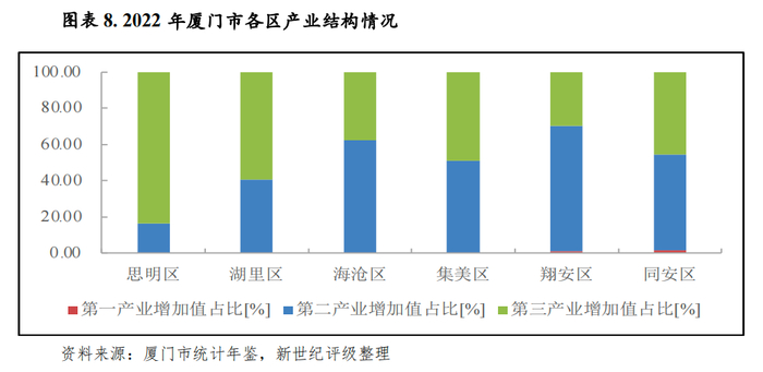 厦门市下辖各区经济发展存在一定差异,2022年各区均经济保持增长,岛内思明和湖里两区作为传统核心城区,服务业较发达,经济体量居前,对全市经济贡献度较大,2022年地区生产总值分别为2503.88亿元和1681.94亿元,同比分别增长5.2%和3.3%,合计占全市经济总量的53.6%。岛外海沧、集美、翔安和同安四区经济体量较小,其中海沧区2022年GDP为1067.48亿元,首次突破千亿;集美区、翔安区和同安区分别实现地区生产总值956.58亿元、887.14亿元和705.63亿元,其中翔安区经济增速为6.0%,在投资等拉动下保持较快的增长赶超态势。2023年前三季度,各区经济规模排序保持稳定,但经济增速分化较大,海沧区、湖里区经济出现负增长,思明区、翔安区经济增速维持在较高水平。