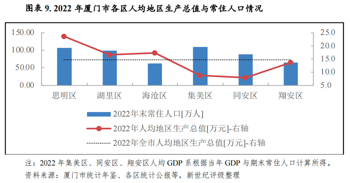 从人均指标来看,2022年厦门市人均地区生产总值14.74万元,思明区、海沧区和湖里区人均地区生产总值高于全市水平,分别为23.53万元、17.29万元和16.64万元;翔安区人均地区生产总值排名第四,2022年为13.75万元,集美区和同安区落后于全市水平,分别为8.77万元和7.91万元。