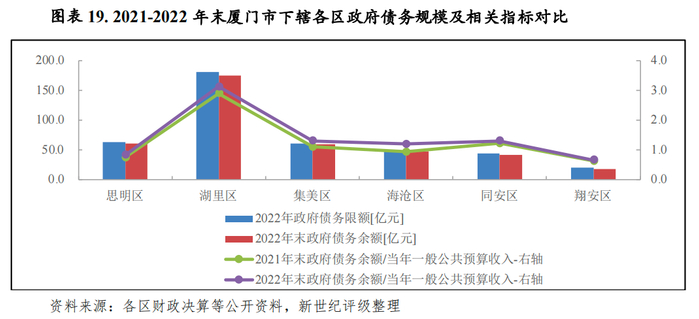 以2022年末各区政府债务余额与当年一般公共预算收入相对比,2022年末思明区和翔安区政府债务余额均能够被其当年一般公共预算收入覆盖,分别为0.8倍和0.7倍,湖里区该比值在各区中最高,为3.1倍;集美区、海沧区和同安区分别为1.3倍、1.2倍和1.3倍。