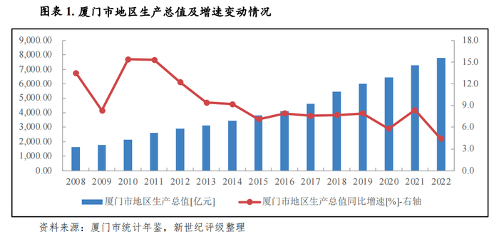 厦门市是我国首批实行对外开放政策的经济特区、海峡西岸贸易中心城市、计划单列市,也是中央支持发展的国际航运中心、国家科技金融结合试点城市和两岸区域性金融服务中心,综合交通网络体系发达,区位及政策优势明显,产业基础良好,经济对外开放程度高。近年来厦门市不断推进产业结构优化升级,已形成以平板显示、计算机与通讯设备、机械装备、旅游会展、航运物流等为重点的中高端产业链群,经济发展水平较高,发展态势良好。2022年厦门市主要经济指标保持增长,2023年以来受重点行业去库存压力,全市工业生产承压,同时受固定资产投资有所收缩、消费潜力有待释放等综合影响,经济增速放缓。