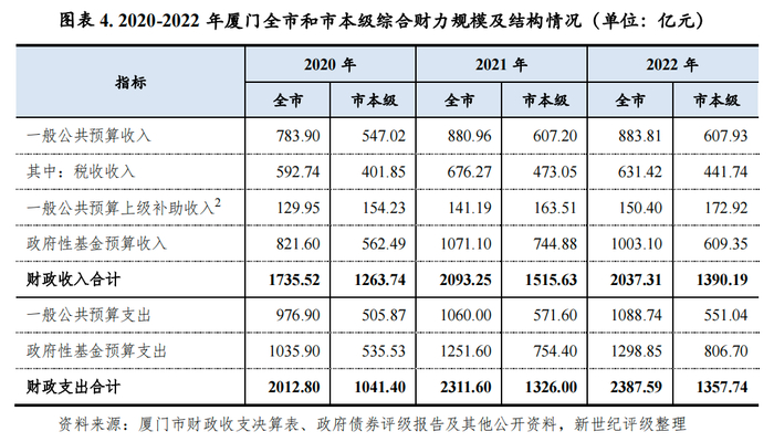 厦门市综合财政实力较强,受益于良好的产业基础以及计划单列的体制因素,一般公共预算收入规模较大且质量较优。2022年受外部不利环境以及留抵退税政策性因素影响,税收收入出现下滑,但在非税收入超常增长拉动下,全市一般公共预算收入实现微幅增长。政府性基金预算收入是厦门市地方财力的重要支撑,2022年受供地规划、市场因素等影响,收入规模略有下降,考虑到目前房地产行业仍持续承压,2023年以来厦门市土地市场未现企稳迹象,后续政府性基金收入存在下滑风险,对地方综合财力稳定性或将产生不利影响。