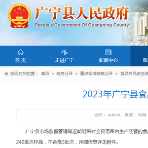 广宁县市场监督管理局近期组织对全县范围内生产经营的食品进行监督抽检工作,共抽检243批次。经广州市宜健医学技术发展有限公司检验,合格240批次样品,不合格3批次,详细信息详见附件。