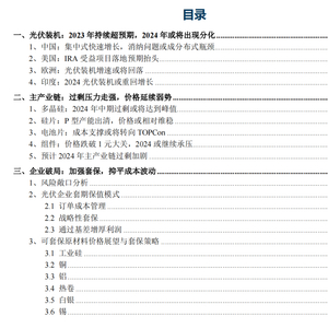 从产业链角度看,2023年光伏主产业链产能持续释放,各环节过剩不断加剧。多晶硅方面,新增产能投产有所加快,目前价格已跌至成本线附近,预计2024年价格有继续承压风险;硅片方面,库存去化周期完成,下游需求维持稳定,预计价格走弱空间有限;电池片方面,预计TOPCon产能释放速度将有所加快,落后P型产能或面临出清;组件方面,上游成本持续回落驱动组件价格偏弱运行,目前中标价已见到低于1元/W的价格,预计2024年继续下跌的动能不足,但如果产业链过剩压力未得到有效缓解,组件价格亦难有上行动力。