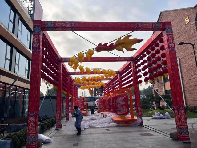 本周天气晴好,这也为爱企谷的传统花灯搭建创造了有利条件。在爱企谷入口处,工作人员正在搭建花灯龙门架,营造浓厚节日氛围。由于龙造型花灯要遍布爱企谷各个角落,手工艺人需要根据屋顶、露台等空间,现场制作花灯。