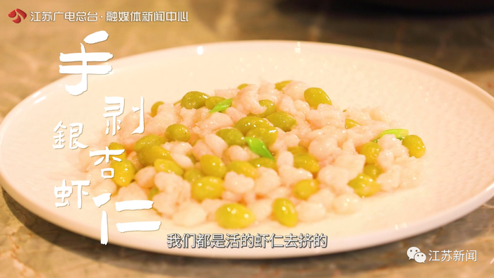 还有这道手剥银杏虾仁,虾仁都是用活虾来挤,每天定时定量供应,在秋天会配上银杏,古惠济寺的一棵千年银杏树,银杏果每年都会在特定的时间限量供应给金陵饭店,要是碰巧能吃上,那就真有口福咯!