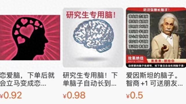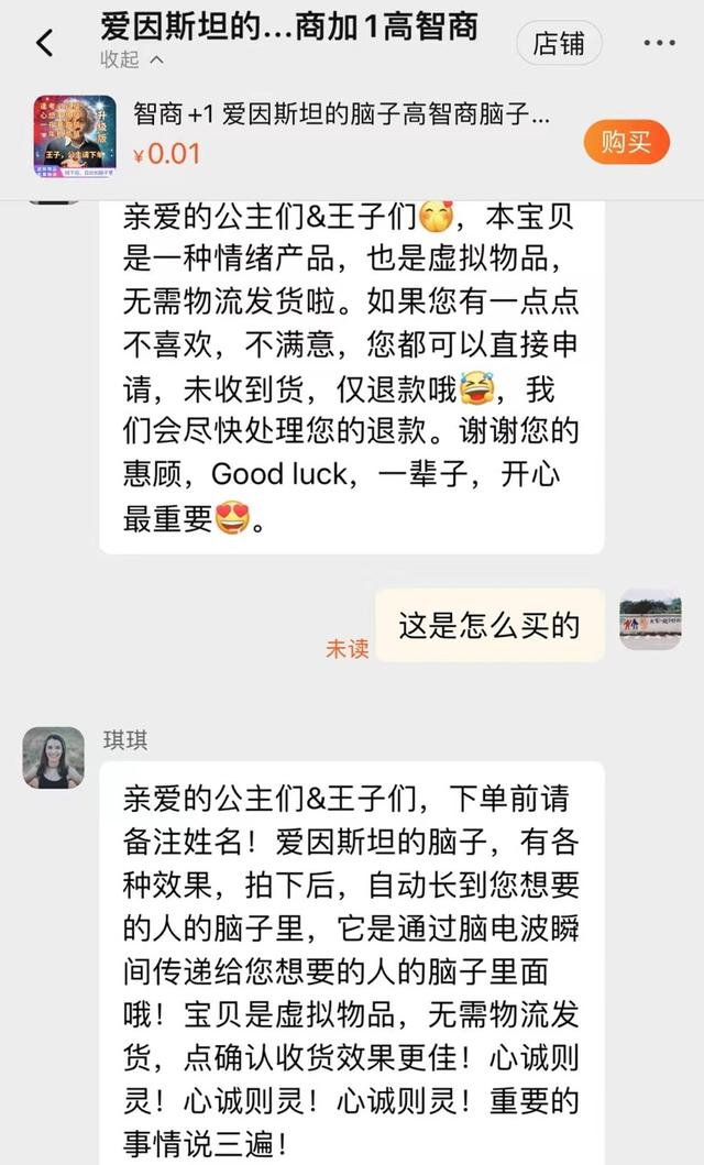 商品拍下之后呢?“爱因斯坦的脑子,有各种效果,拍下后,自动长到想要的人的脑子里,通过脑电波瞬间传递。”店主跟记者说明。但这显然是无稽之谈,“脑子”不会再长出来,脑电波更不会瞬间传递。