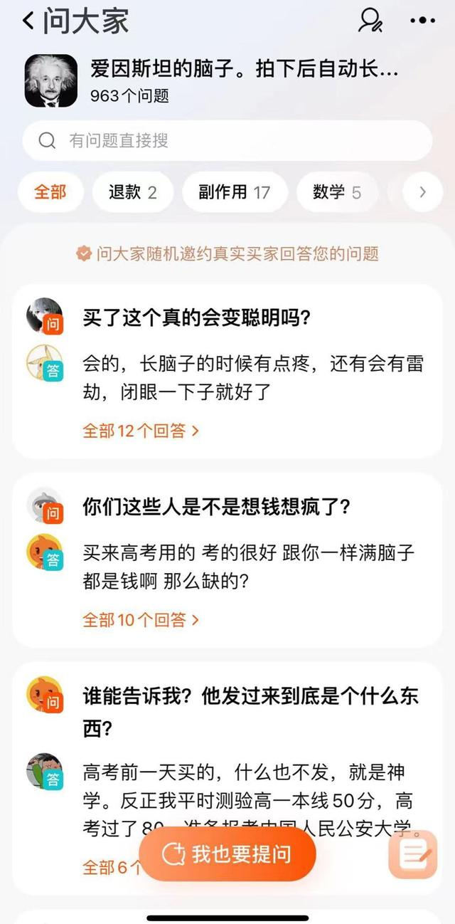 打开评论区便能发现,此类虚拟商品戳中的是年轻人追求的“情绪价值”。大家下单购买的并非实际使用效果,而是共同玩梗的体验和乐趣。有人要看实体图,有人问保质期,更多的人在评价效果,“买了真的有用吗?变聪明了,长脑子的时候还有点疼。”还有人调侃,“买来考公不太行,得换个中国脑子。”