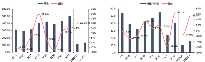 2015年—2023年第一季度国投电力营收及归母净利润增速