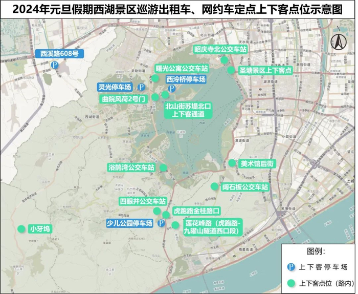 2.在美术馆后街、莲花峰路(虎跑路至九曜山隧道西口段)、虎跑路金桂路口、曲院风荷2号门、阔石板公交车站、浴鹄湾公交车站、曙光公寓公交车站、昭庆寺北公交站、四眼井公交站、圣塘景区上下客点、北山街苏堤北口上下客通道、小牙坞设置12个临时停车点,允许出租车、网约车上下客。停车点200米范围内禁止出租车、网约车上下客。