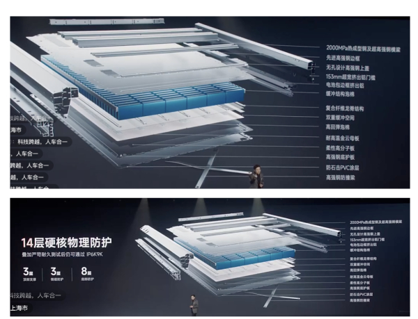 物理防护上,电池包拥有14层物理防护,包括2000MPa热成型钢及超高强钢横梁、先进高强钢边框、153mm超宽挤出铝门堪等。同时,电池经受了全球最严苛的热失效安全标准,并采用电芯倒置技术,保证电芯在极端热失控的情况下,快速向下释放热源,最大程度保证乘员舱安全。