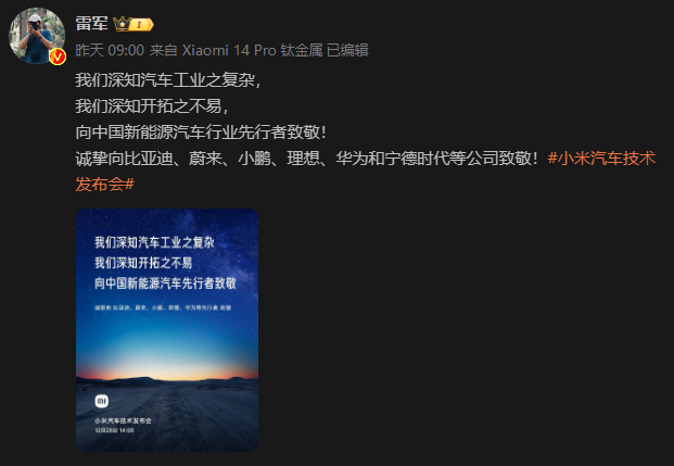 有的只是四行字,其中最高能的在最后一行:诚挚向比亚迪、蔚来、小鹏、理想、华为和宁德时代等公司致敬!并附上了#小米汽车技术发布会# 的标签。