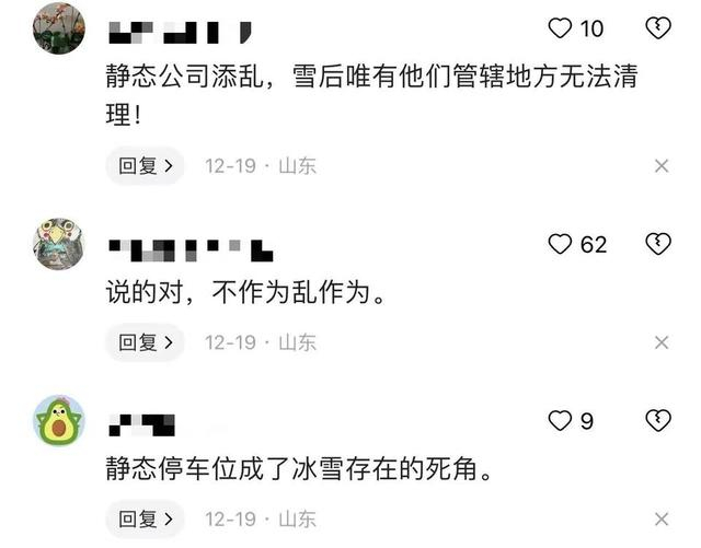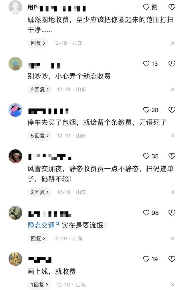 日前,一场暴雪席卷了济南,全城银装素裹。欣赏雪景之余,为方便市民出行,全市的除雪工作也在着力开展。然而,网友“胡氏门中一男儿”发帖称,“静态交通停车位上所收费用归济南静态交通集团,那停车位上的积雪为何无人清理,光要钱不办事?”也有市民跟帖称,风雪交加夜,静态收费员一点不静态,扫码递单子,码耕不辍!有不少车主在暴雪后,发现满是积雪的车门上仍夹有静态交通的缴费单,让不少车主哭笑不得。对此,有更多市民留言表示“:没有相应的管理和服务,只知道收费,这钱我不愿意交。”