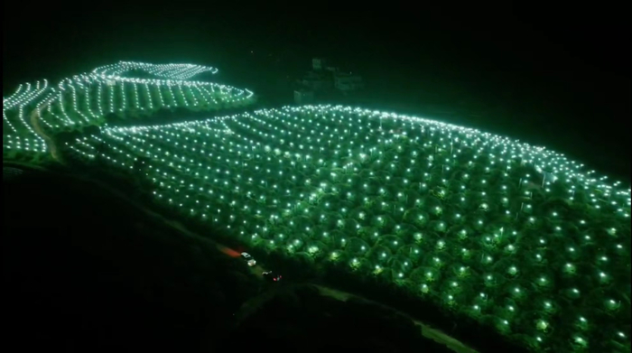 一盏、两盏……一盏盏灯,亮起来了。荔枝树上亮起的点点繁星,形成了夜晚的山头一片令人期待的小“星空”。