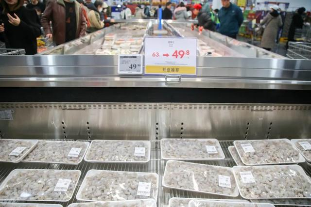 记者注意到,现场不少受欢迎的热门产品都打上了黄色的降价标签,让市民买得更实惠。比如意式肉酱披萨从59.9元下降到49.9元,青虾仁从63元/斤降价到49.8元/斤。周阿姨家常吃青虾仁,趁着降价多囤几份:“我一直买这款虾仁的,现在一斤就便宜了13元,真的划算。”