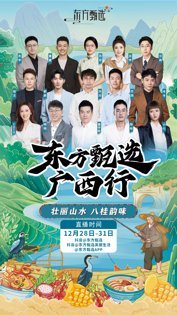 12月28日—31日,国内农产品直播电商机构东方甄选,将在广西举办“东方甄选广西行”直播专场。此次东方甄选广西行,在广西壮族自治区文化和旅游厅、商务厅、农业农村厅以及广旅集团等各单位大力支持下举办。东方甄选团队特意选择山水秀美的广西,为2023年画上圆满句号,与全国网友一起跨年迎新。
