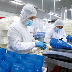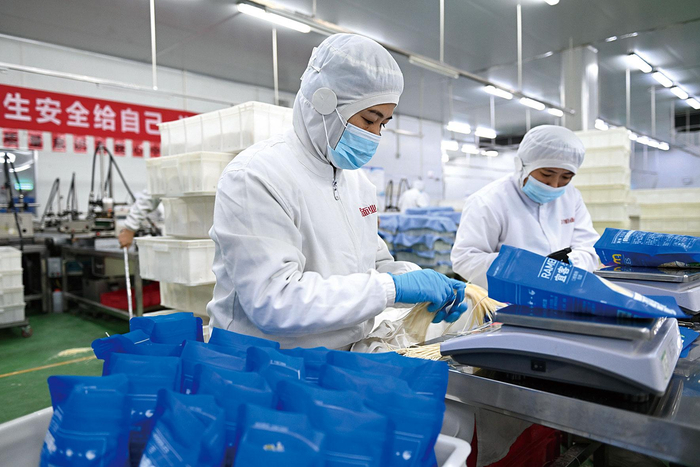 近年来,河北省邢台市隆尧县依托优质小麦生产基地等当地农业资源优势,大力发展食品工业,通过鼓励企业 加大研发投入力度、丰富产品业态等措施,持续做强做优食品产业链、供应链。图为2023年12月21日,位于隆尧县的 河北今旭面业有限公司工人在车间内包装面食产品。新华社记者 牟宇摄