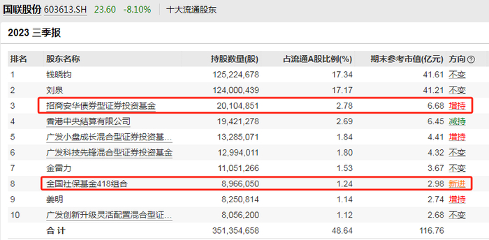 但是除了深陷国联股份巨坑的广发基金之外,首当其冲的就是招商华安A(008791.OF),第二大重仓股就是国联股份,而且在去年末还没拿几股国联股份,今年第二季度里爆量加仓到近两千万股、三季度末则已经超过了两千万股。要知道这可是一只债券型基金呀,股票资产占比不到20%,也上赶着来凑国联股份的热闹,这背后正常吗?