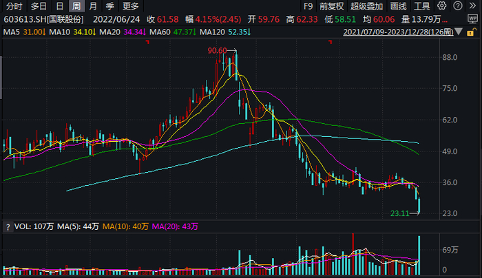 刚才力场君就说过,国联股份之前就爆出了净额法调整收入事件,其实在净额法调整之前,针对该公司收入真实性、客户交易的合理性,就有很多市场质疑之声,小伙伴不难查到,力场君就不赘述了。其实也正是来自于媒体的质疑,直接导致国联股份股价在去年11月25日和28日连续两个跌停,并就此走上了漫漫熊途。